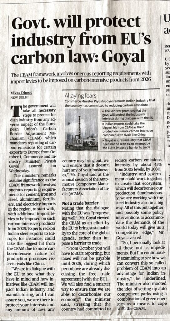 Economic Impacts: CBAM could potentially increase the cost of Indian exports to the EU, particularly in sectors with higher carbon footprints (like Iron and Steel). Indian businesses may face challenges in remaining competitive within the EU market.